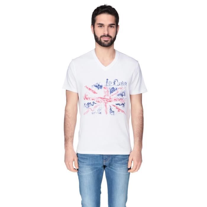 T-Shirt col V, 100 % coton, blanc. Manches courtes, sérigraphie.