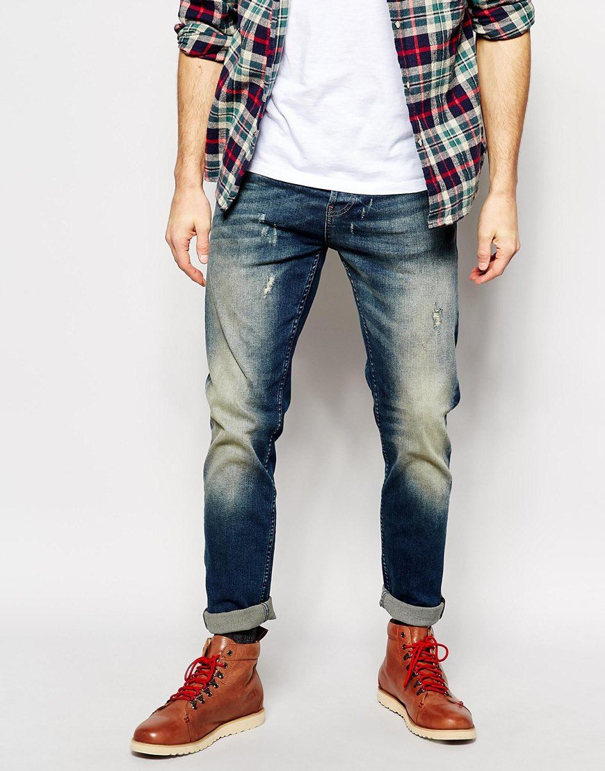Only - & Sons - Jean slim avec déchirures et motifs rapiécés - Bleu