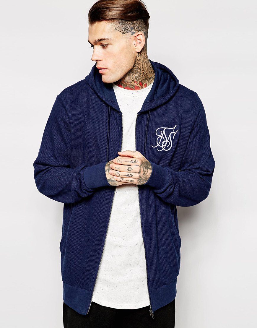 • SikSilk - Sweat à capuche zippé coupe longue en piqué - Bleu marine