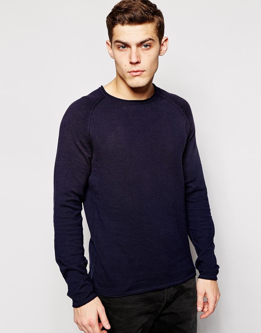 • Solid - Pull en maille lĂ©gère Ă  bords bruts coupe slim - Bleu marine