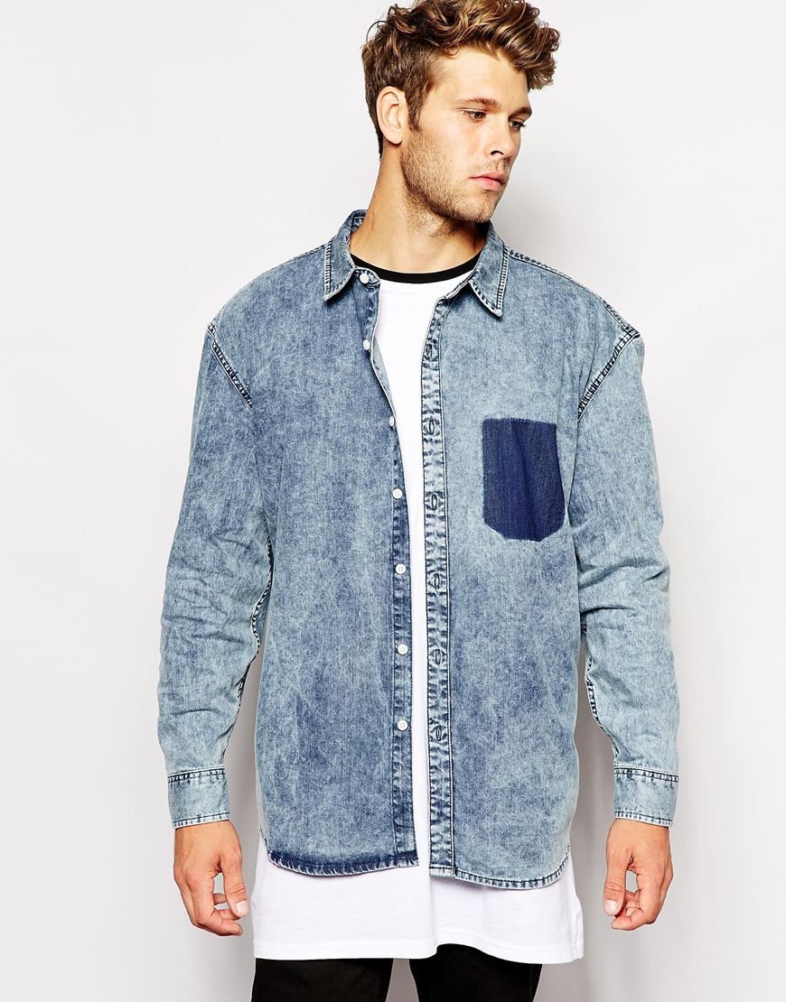 • The Laundry Folk - Chemise ample en jean délavé à l'acide avec poche imprimée - Bleu