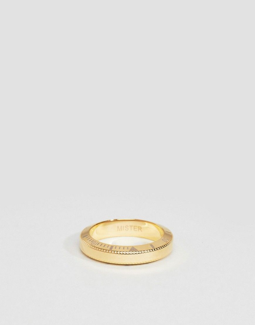 Bague par Mister, Fini doré, Modèle avec indices sur l'heure, Anneau large, 100% acier inoxydable. À PROPOS DE MISTER The San Francisco-born designers behind Mister engineer each statement piece of jewellery with quality and comfort in mind. À l'aide des techniques de fabrication les plus high-tech, la marque appose sa touche de modernité sur des bracelets double tour, des colliers chaînes et des bagues.