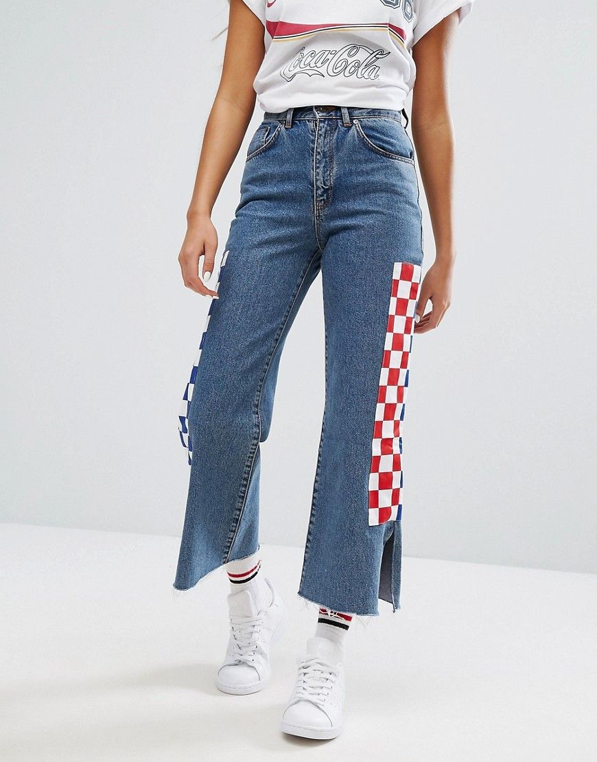 The ragged priest - - Jean style skateur fendu à la cheville avec empiècements à motif damier - Bleu