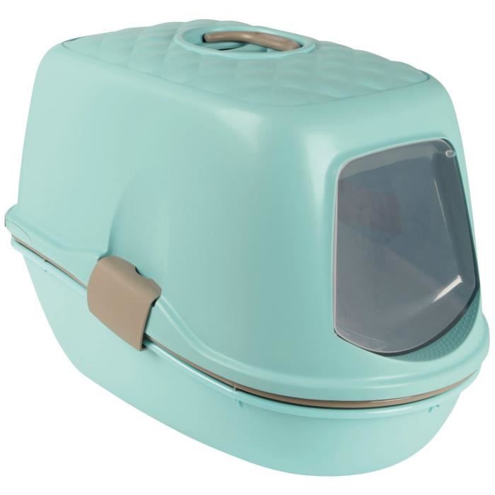 Bac ? liti?re Berto Top avec toit - En plastique - Avec couvercle, trappe et poignée - Filtre ? charbon actif - 2 tiroirs et 1 tamis facile ? utiliser et ? nettoyer - Fermetures Easy Click - Syst?me de déchets indépendant et hygiénique - Dimensions : 39x42x59 cm - Coloris : bleu clair, taupe et granite - Pour chat.