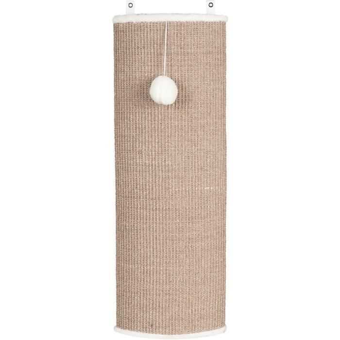 Griffoir - En bois, sisal et peluche - Face arri?re recouverte de peluche - En courbe pour une position de griffoir naturelle - Avec jouet suspendu ? un fil - A suspendre - Dimensions : 26x78x6 cm - Coloris : blanc et beige - Pour chat.