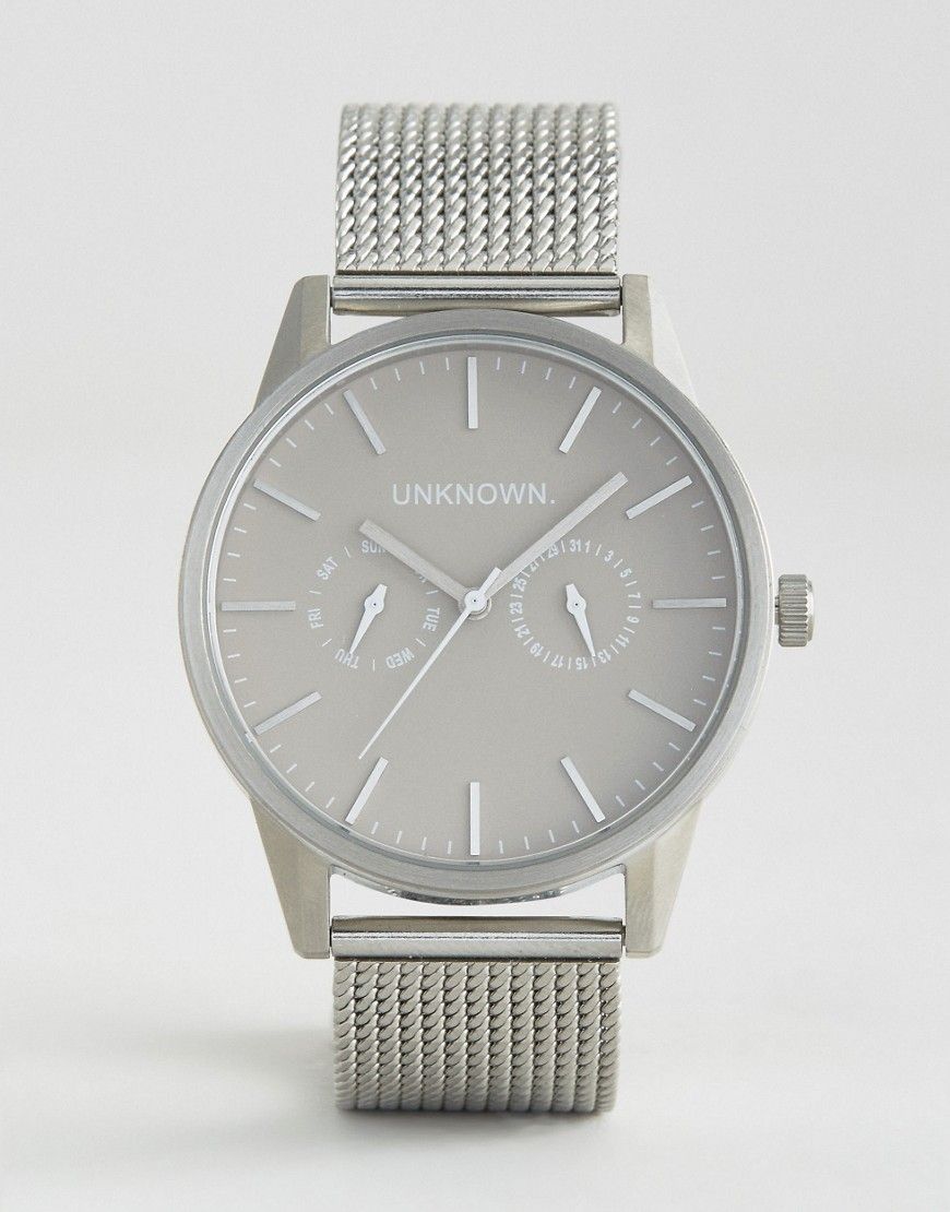 Montre par UNKNOWN, Bracelet en acier inoxydable effet maille, Boîtier en acier inoxydable, Mouvement à trois aiguilles, Sous-cadran chronographe, Repères traits, Remontoir sur un côté, Fermoir déployant. À PROPOS D'UNKNOWN La marque emblématique londonienne UNKNOWN secures instant wrist appeal with their contemporary timepieces. Inspired by the anonymous creator of the first wristwatch, UNKNOWN keeps things clean and refined with a minimal aesthetic and handpicked, quality components. Pour ses créateurs basés à Shoreditch (et qui aiment rester anonymes eux aussi), le souci du détail représente la priorité absolue, qu'il s'agisse de leur montres à bracelet en cuir ou des modèles analogiques. Modèle : UN16EN27 Boîtier : acier inoxydable Largeur du boîtier : 39 mm Épaisseur du boîtier : 8 mm Bracelet : acier inoxydable Fermeture : boucle déployante Mouvement : quartz