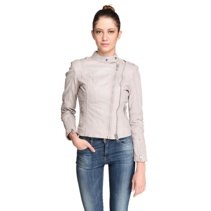 Blouson style Perfecto, col officier, 100 % cuir, gris clair, double zip. Manches longues, pattes sur épaules, 2 poches, poignets zippés. Style Casual.