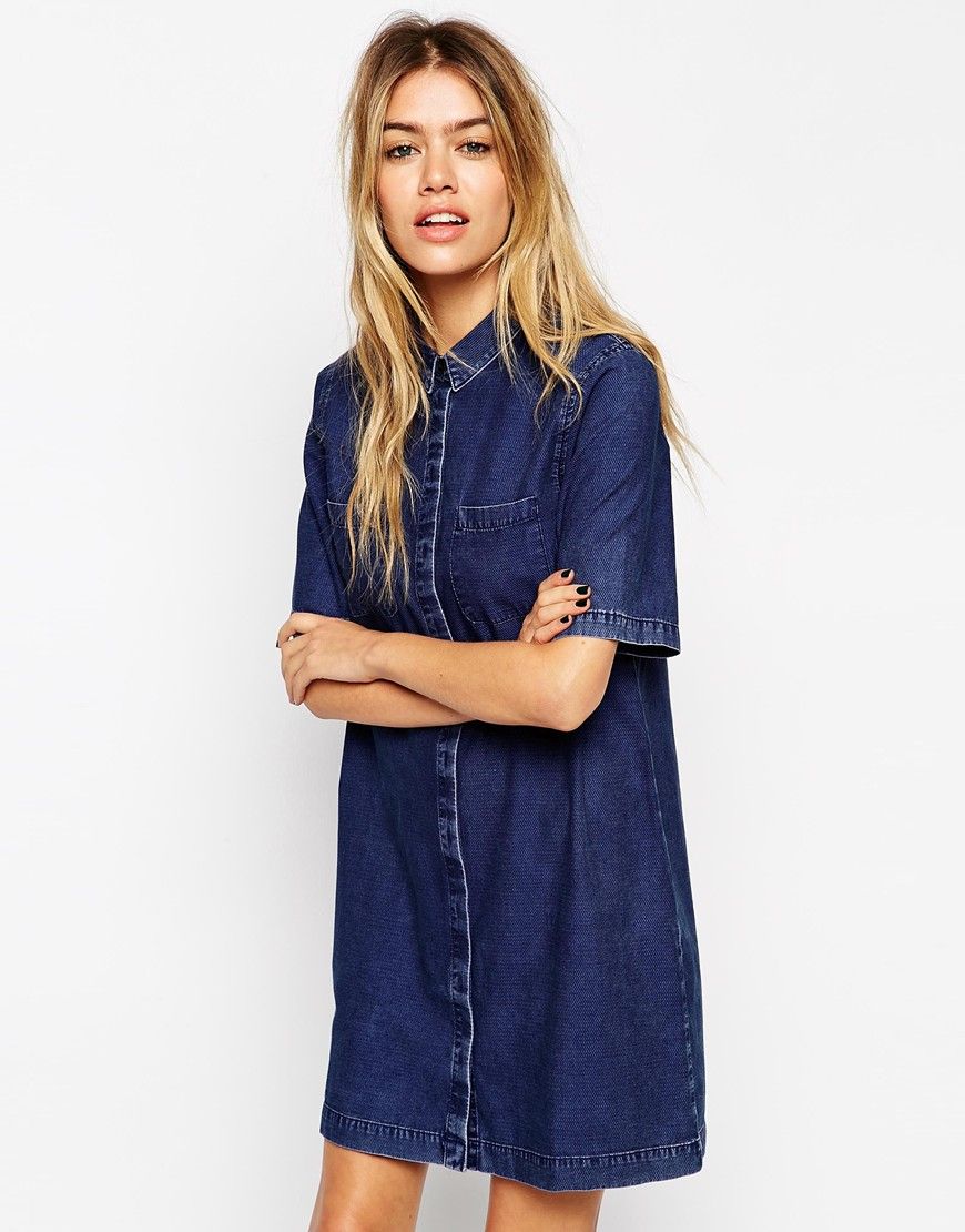 ASOS - Robe chemise en jean à poche plaquée - Délavage bleu foncé
