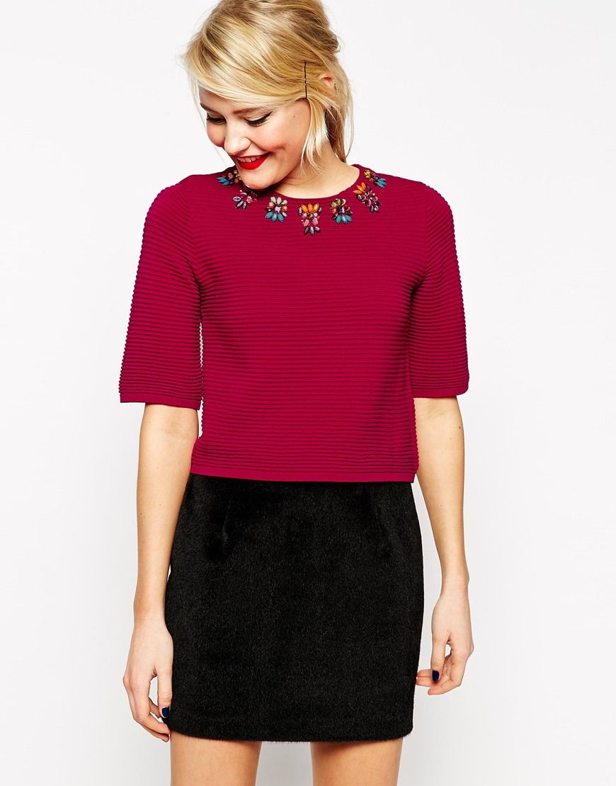 • ASOS - Top court en tricot cĂ´telĂ© effet vagues avec encolure ornementĂ©e - Magenta