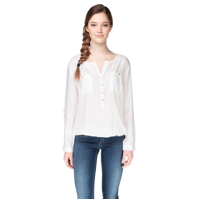 Blouse unie 100 % viscose, blanc. Col tunisien. Boutons.