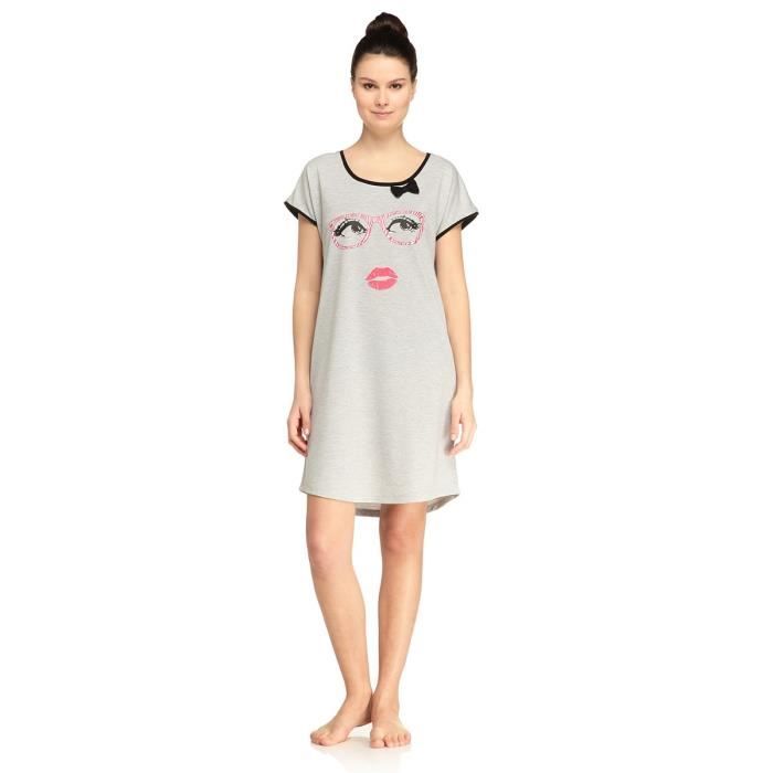 Chemise de nuit col arrondi, 65 % polyester, 35 % viscose, gris chiné. Manches courtes, noeud fantaisie, sérigraphie.