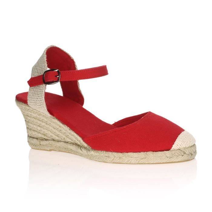 Sandales compensées en textile avec bride a la cheville et semelle en corde tressée, coloris rouge et beige. Fermeture par boucle de serrage.