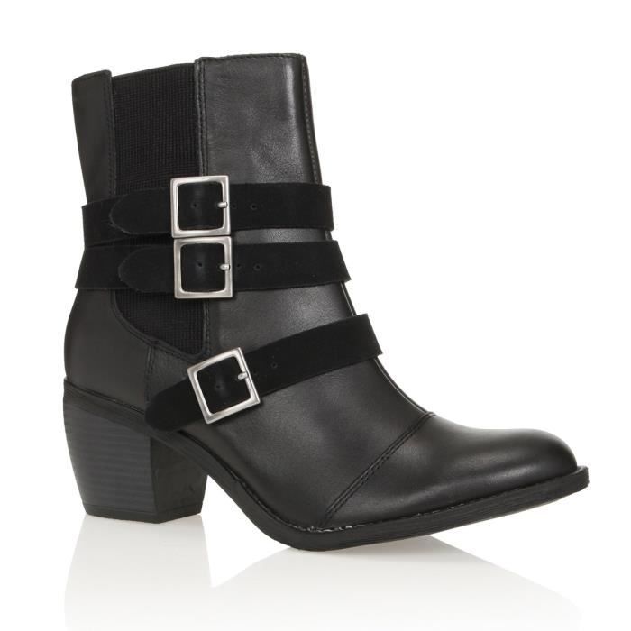 Bottines a la tige moyenne en cuir de vachette lisse avec brides en croûte de cuir et élastiques de confort sur le côté, coloris noir. Fermeture zippée.