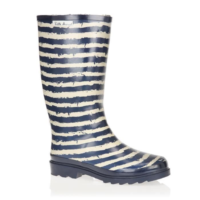 Bottes de pluie a la tige haute en caoutchouc, imprimé a rayures, intérieur en fourrure synthétique, coloris marine et beige.