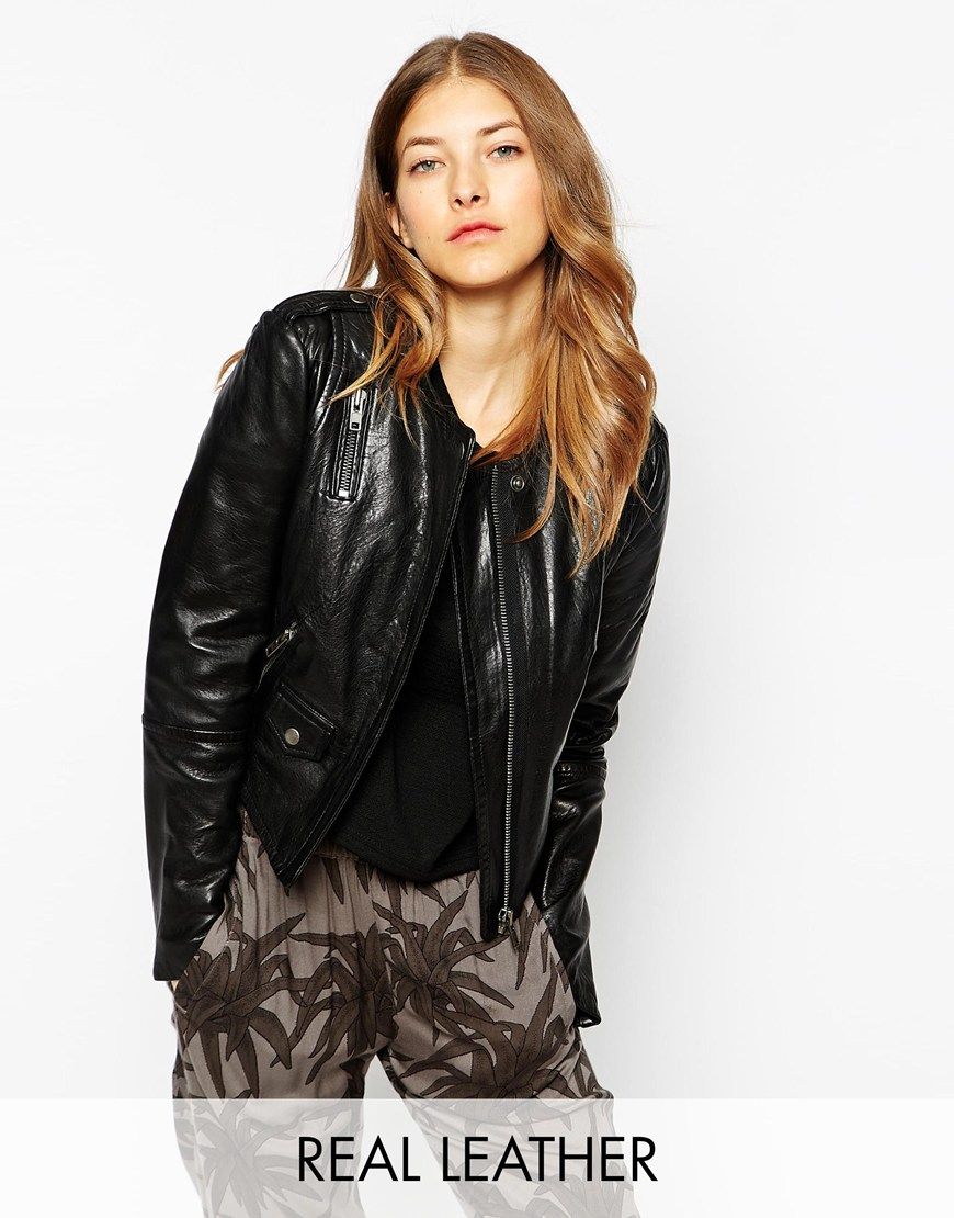 DESCRIPTIF PRODUIT Corps : 100% cuir véritable. Doublure corps : 100% coton. Doublure manches : 100% polyester. TAILLE & COUPE Le mannequin porte l'article en taille UK 8 / EU 36 / US 4 ENTRETIEN Nettoyage à sec par un spécialiste du cuir uniquement