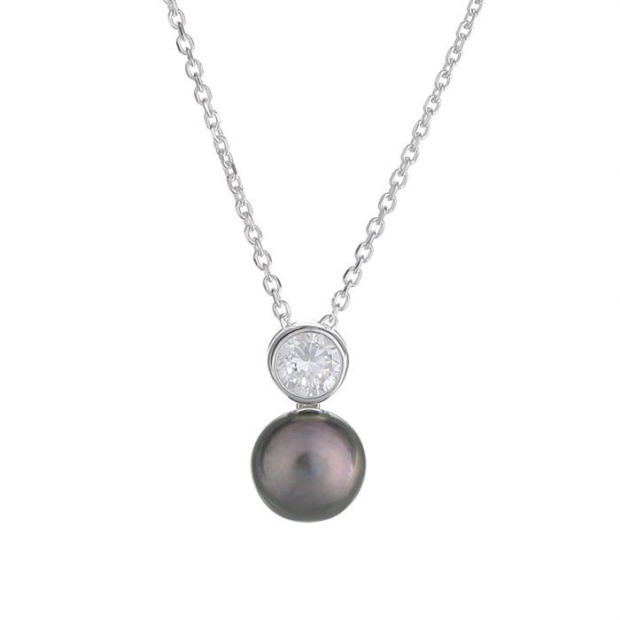 Collection Perle de Culture. Modele Perle élégante grise. Collier en argent 925/1000 composé d'une béliere orné d'un oxyde de zirconium et d'une perle de culture de 8mm grise. Poids de l'argent: 1.1g. Chaque bijou est livré dans un pochon en organza avec un certificat d'authenticité et de garantie