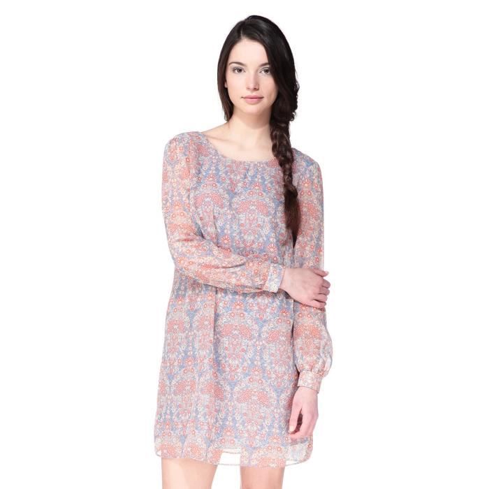 Robe tunique col arrondi, 100% polyester, orange, bleu et blanc. Manches longues, mousseline souple, imprimé cachemire, dos en V, patte boutonnée.