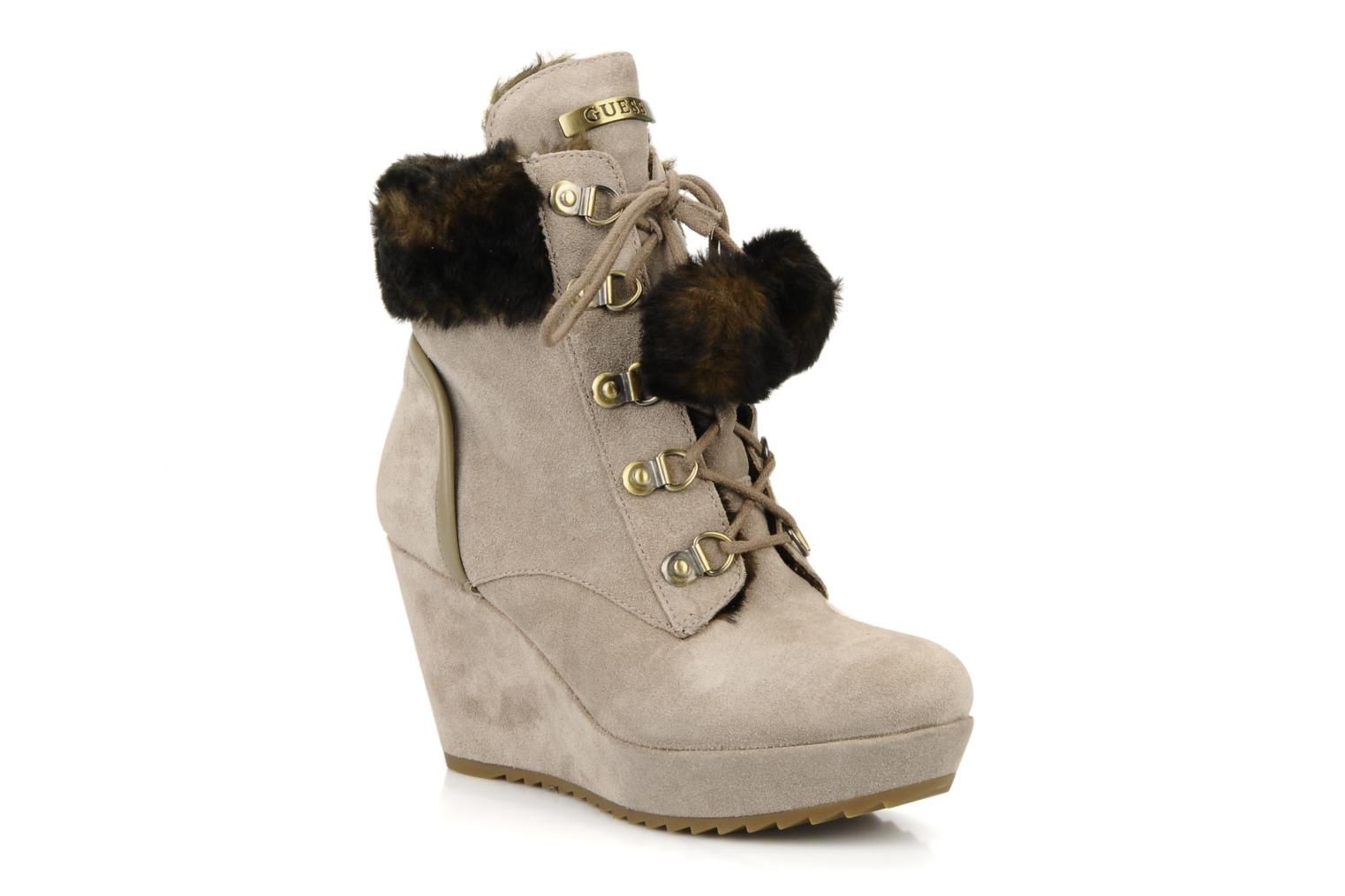 Bottines Guess Postra pour femme, en cuir et textile doublés de fourrure synthétique, à bout rond, à lacets (5 œillets), montées sur une semelle de gomme, avec un talon compensé de 9 cm un plateau de 3 cm. La semelle intérieure est non amovible. Les mesures sont réalisées sur une pointure 38. Difficile de ne pas craquer devant les véritables doudous pour pied que sont les craquantes bottines Postra par Guess, avec leurs irrésistibles pompons de peluche au bout des lacets ! Une régression girly chic dans laquelle on plonge avec délectation !