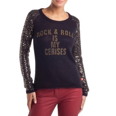 Le temps des cerises - Pull imprimé paillettes et perles col rond sequins sur manches