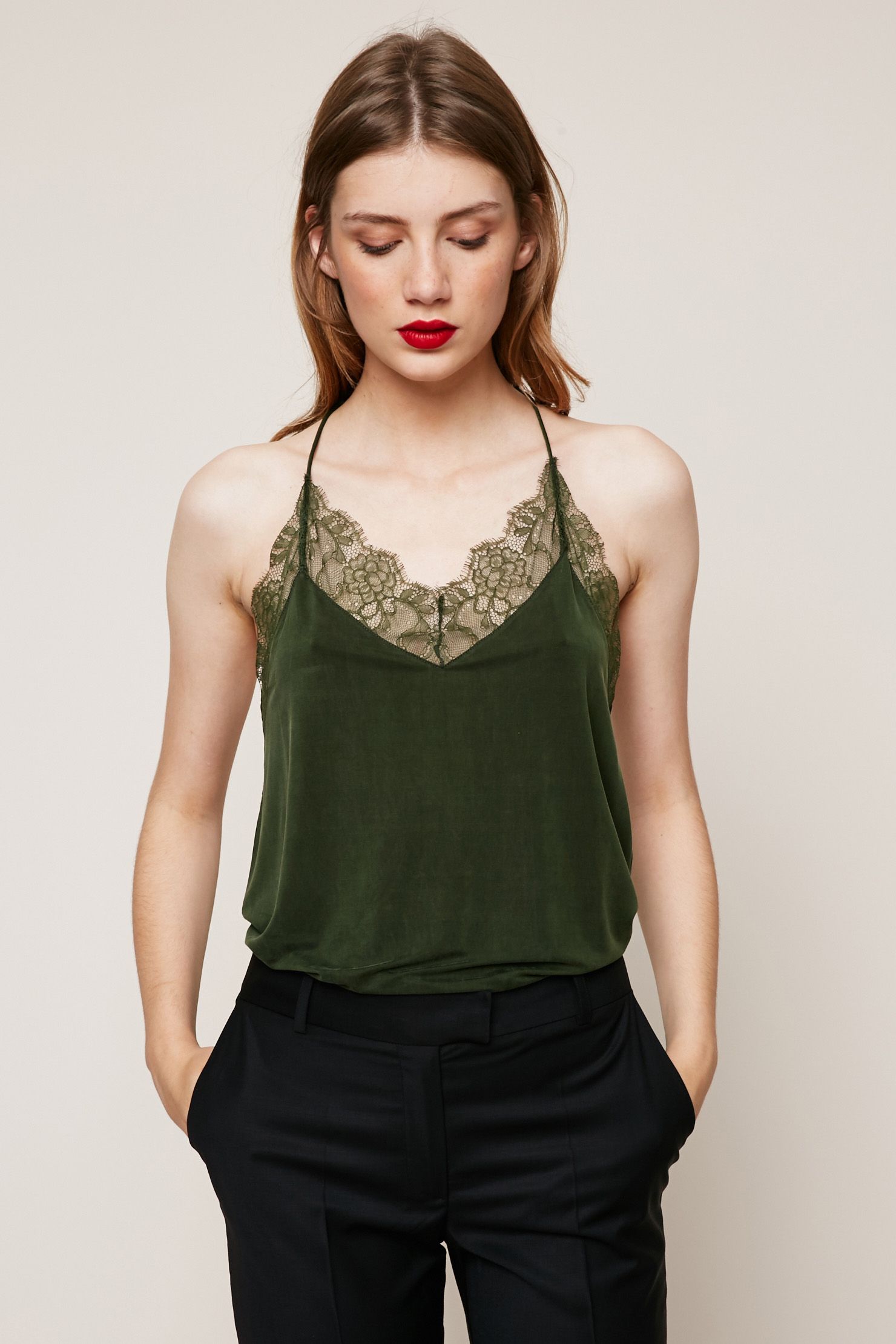 • Samsøe Débardeur fluide vert empiècements dentelles Slipin