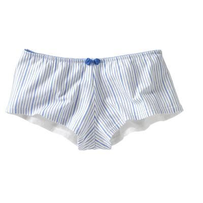 Un shorty très confortable à porter, qui associe le coton et le plumetis dans un esprit frais et féminin. FICHE SHOPPING - devant en coton à rayures avec petit noeud contrasté en haut - dos en plumetis blanc - élastique avec picot à la taille - fond doublé 100% coton COMPOSITI...