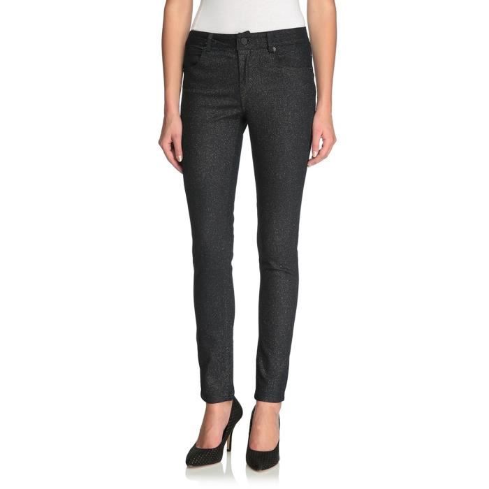 Pantalon slim noir pailleté argenté, coton/élasthanne. Zip, 5 poches.