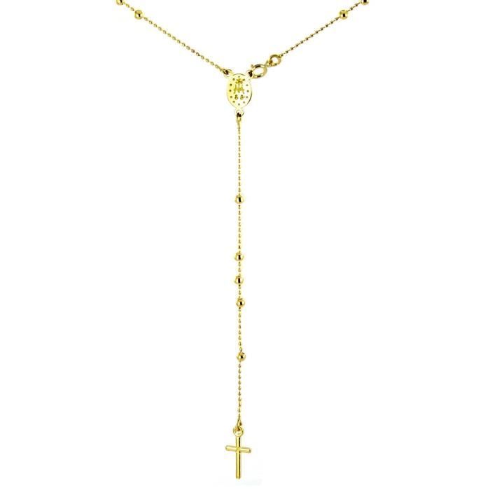 Ce collier chapelet en Or jaune 750/1000 mesure 50 cm de long et est formé a partir d'une chaine "maille boules" de différents diametres . Le fermoir se situe a l'avant et s'accroche a un médaillon a 2 faces représentant la Vierge Miraculeuse. Bijou livré en écrin avec certificat d'authenticité. Poids métal : 5,07 gr. Longueur collier : 50 cm. Taille boules : 2 mm. Fermoir : anneau ressort