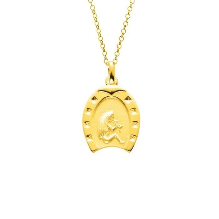 Ce collier zodiaque est composé d'une chaine jaseron et d'un pendentif du signe vierge. Sa forme arrondie et martelée rappelle celui des fers a cheval. Il est en plaqué Or. Sa longueur est de 45 cm et ses dimensions sont 1,2 x 1,9 cm. Ce bijou est livré en écrin avec certificat d'authenticité et de garantie.