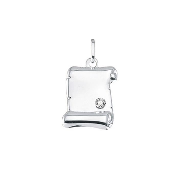 Ce pendentif est en Or blanc 375/00 et dévoile un diamant d'une brillance intense. Il représente un parchemin sur lequel vous pourrez graver un message, des initiales... Un cadeau symbolique, qui vous sera livré en écrin avec certificat d'authenticité et de garantie. Poids métal : 0,5 gr. Poids diamant : 0,006 ct. Qualité diamant : HP1. Dimensions pendentif : 1 x 1,7 cm.