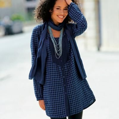 Une tunique fluide et agréable à porter, rehaussée d'une belle encolure plastron et d'un jeu de carreaux très actuel. Agrémentée d'une jolie écharpe assortie.Tunique avec encolure ronde, rehaussée d'un plastron nervuré et froncé. Fermée par bou...